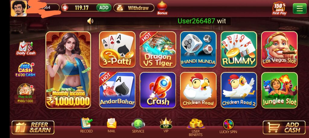 You can see the home screen and the lobby of this game here you will see the teen patti,chiken road,dragon vs tiger,andar bahar,crash,aviator jhandi munda rummy and infinite slots game in one app so dopwnload and earn money now its limited offer for any person